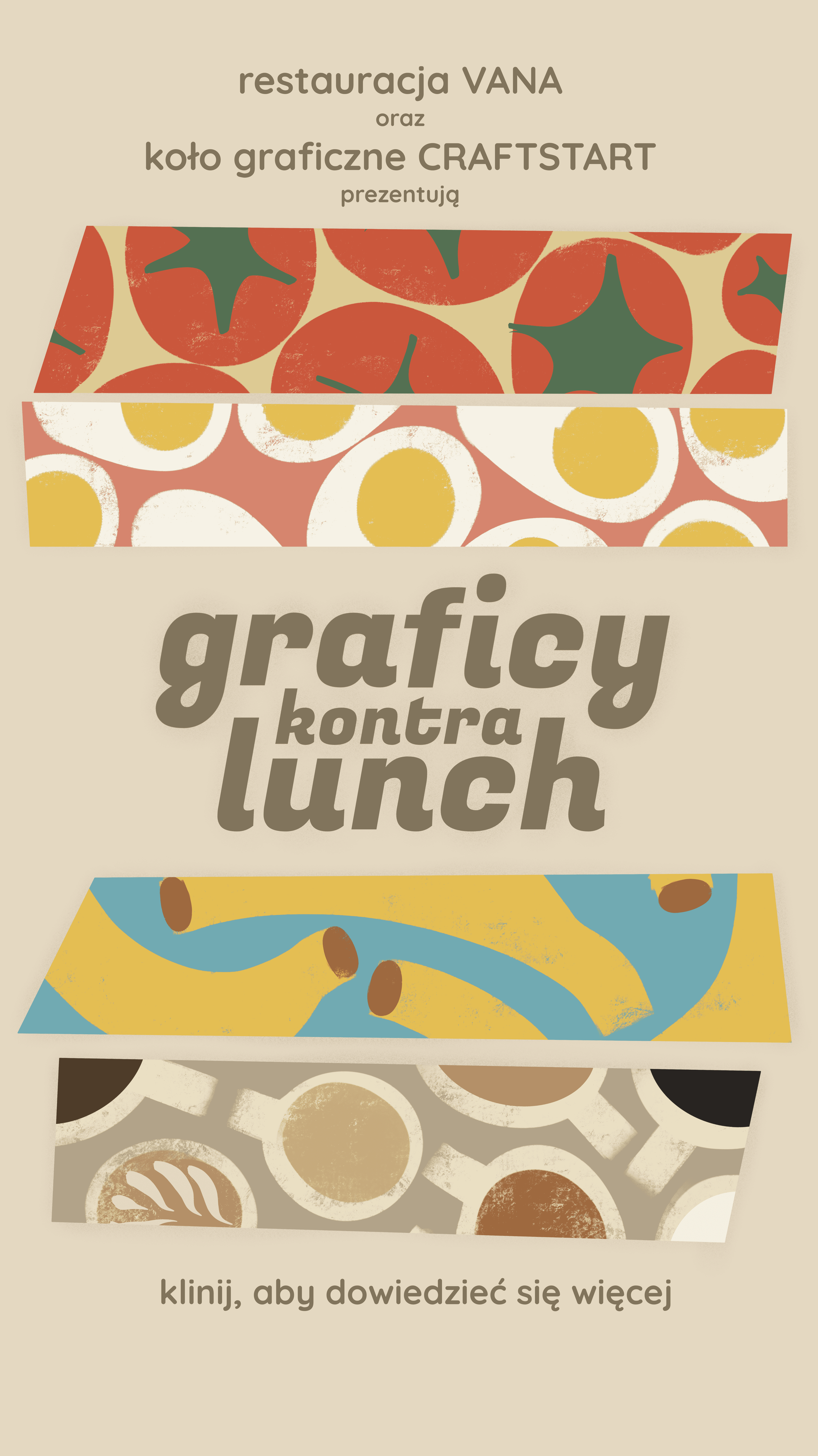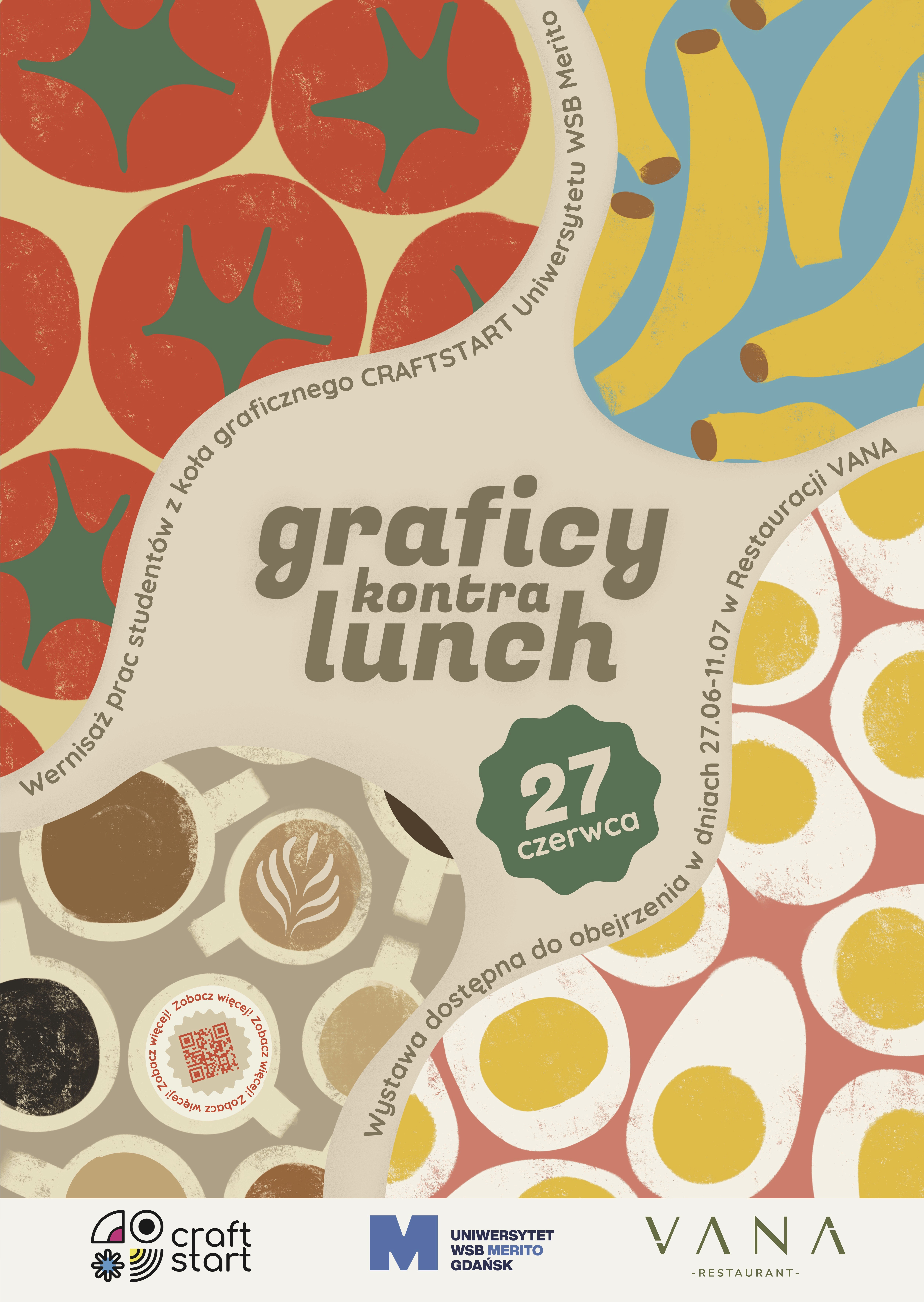 Wystawa "Graficy kontra Lunch" jest efektem współpracy między restauracją VANA a Kołem Graficznym CraftStart z WSB Merito w Gdańsku. Przedstawia ona prace studentów, które czerpią inspirację z potraw serwowanych w restauracji VANA. Głównym celem wystawy jest uchwycenie słodyczy, kolorów i smaków dań w formie graficznej. Identyfikacja wystawy bazowała na kluczu wizualnym lokalu, przez co udało nam się zachować lokalny charakter miejsca.